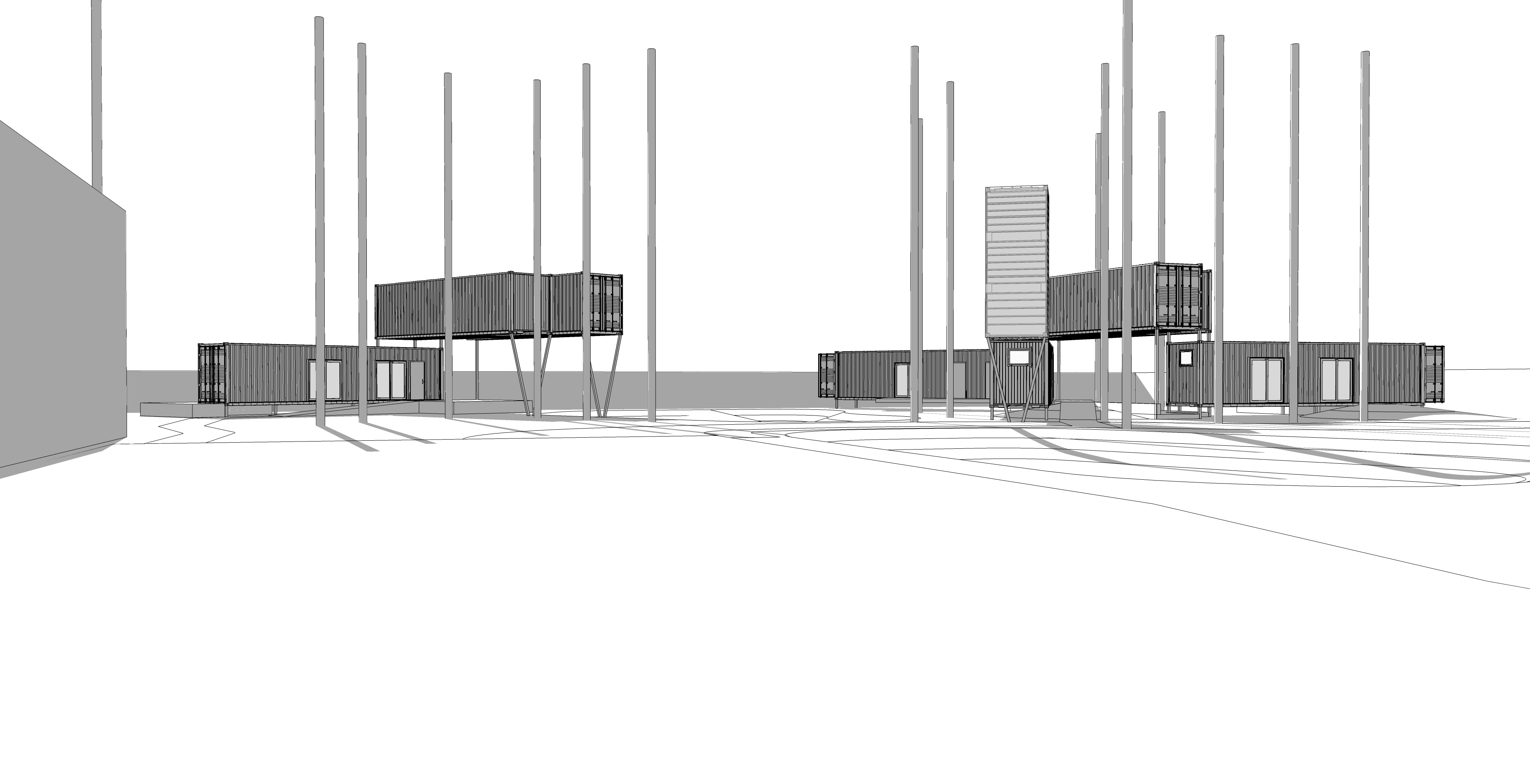A Gainesville client seeks a campus for creative collaboration in the arts. This design carefully slips containers between large pine trees in at the wooded south end of their industrial site.